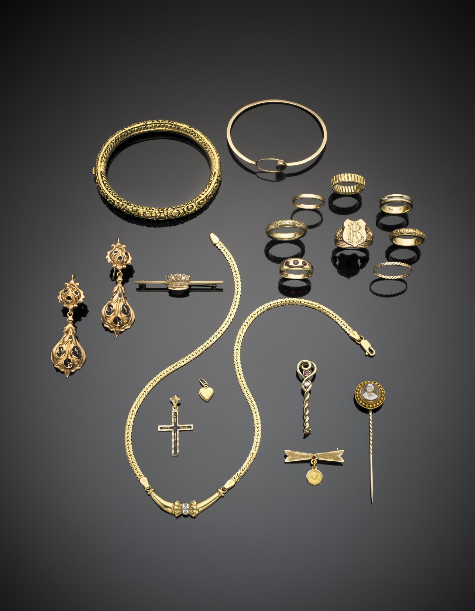 Lotto composto da: otto anelli, una collana, due bracciali rigidi,tre spille, uno spillone, due ciondoli e due orecchini, tutto in oro giallo g.107,20 Yellow gold lot comprising: eight rings, two bangles, three brooches, a pin, two pendants and earrings