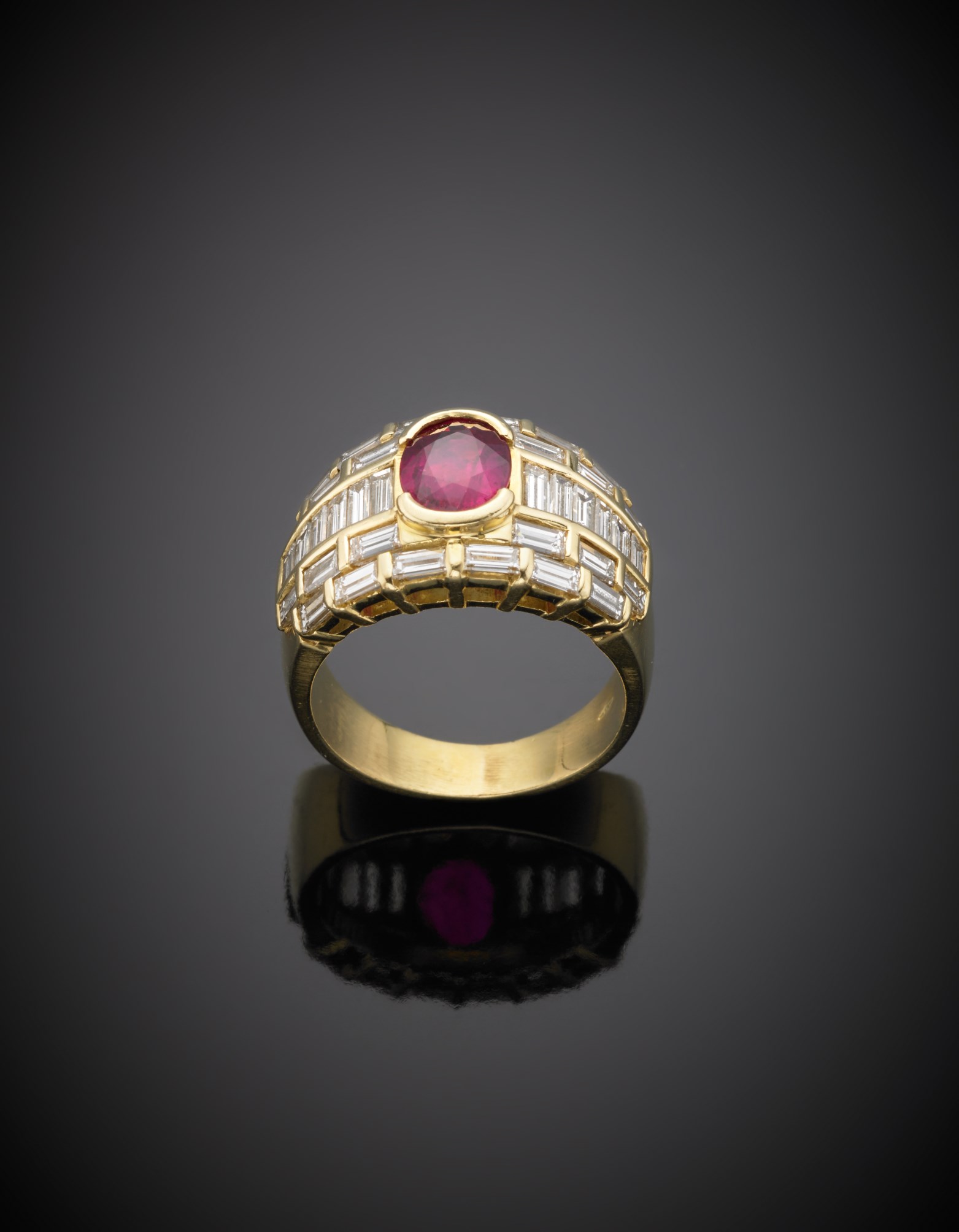 Anello in oro giallo con diamanti baguette e rubino centrale di ct 1,40...