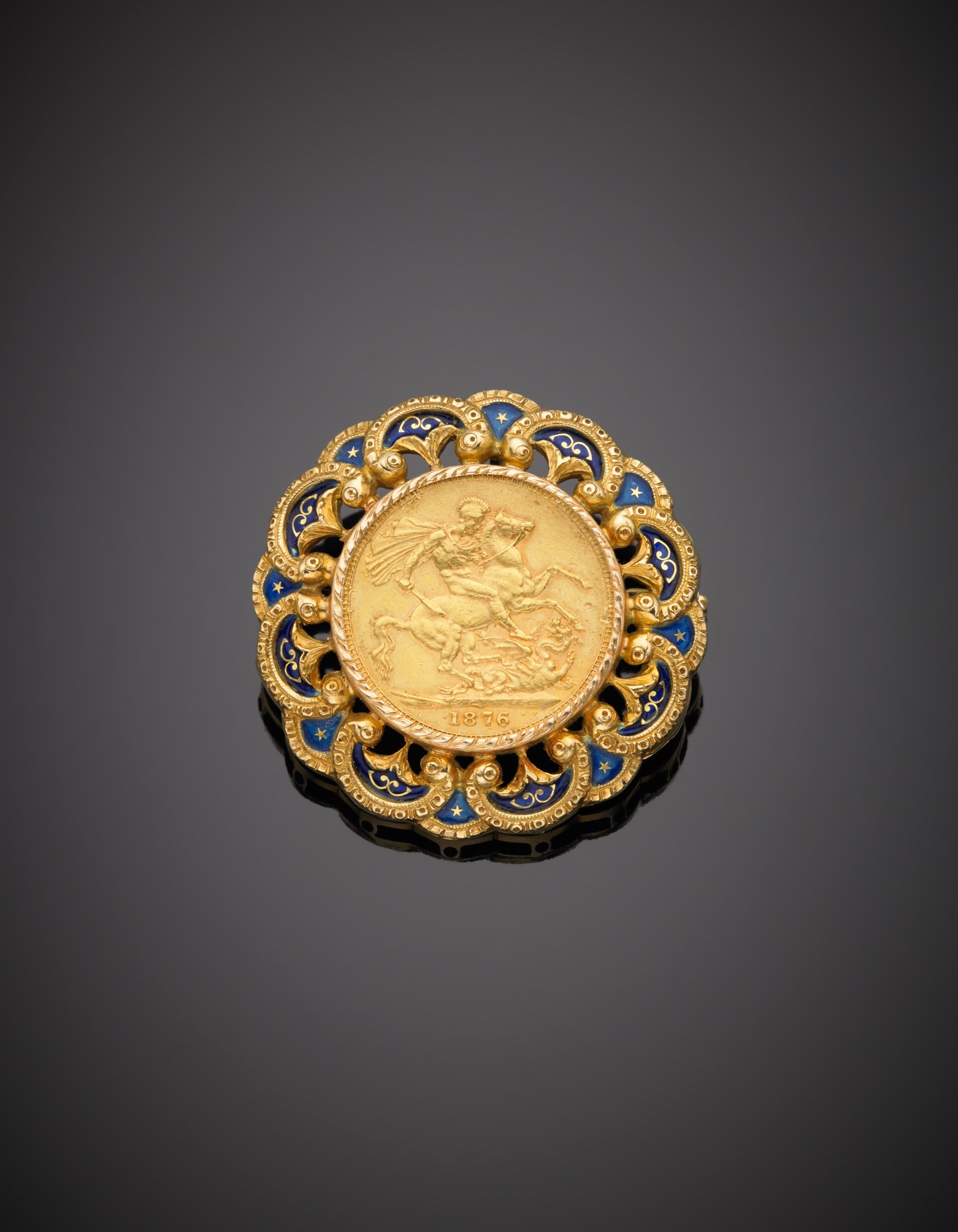 Spilla oro giallo con sterlina inglese del 1876 g.19,80 diam. cm 3,60 A gold Sovreign brooch