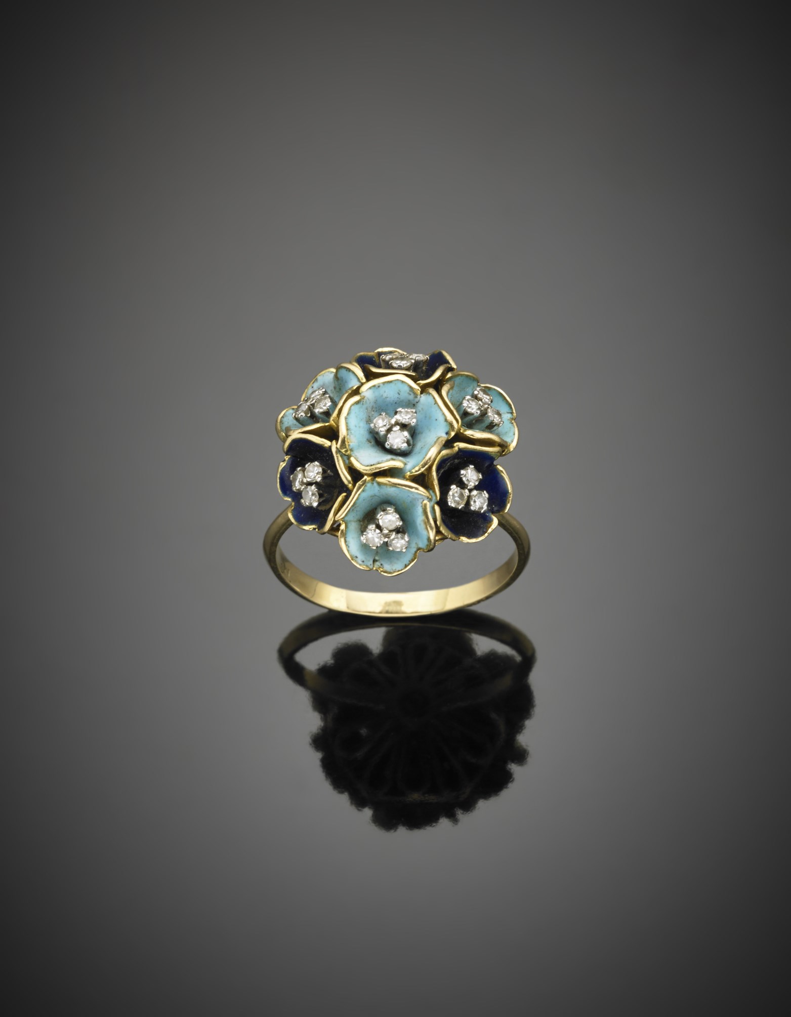 Lotto 537 | Anello in oro giallo e bianco a guisa di fiori con smalti azzurri, blu e...