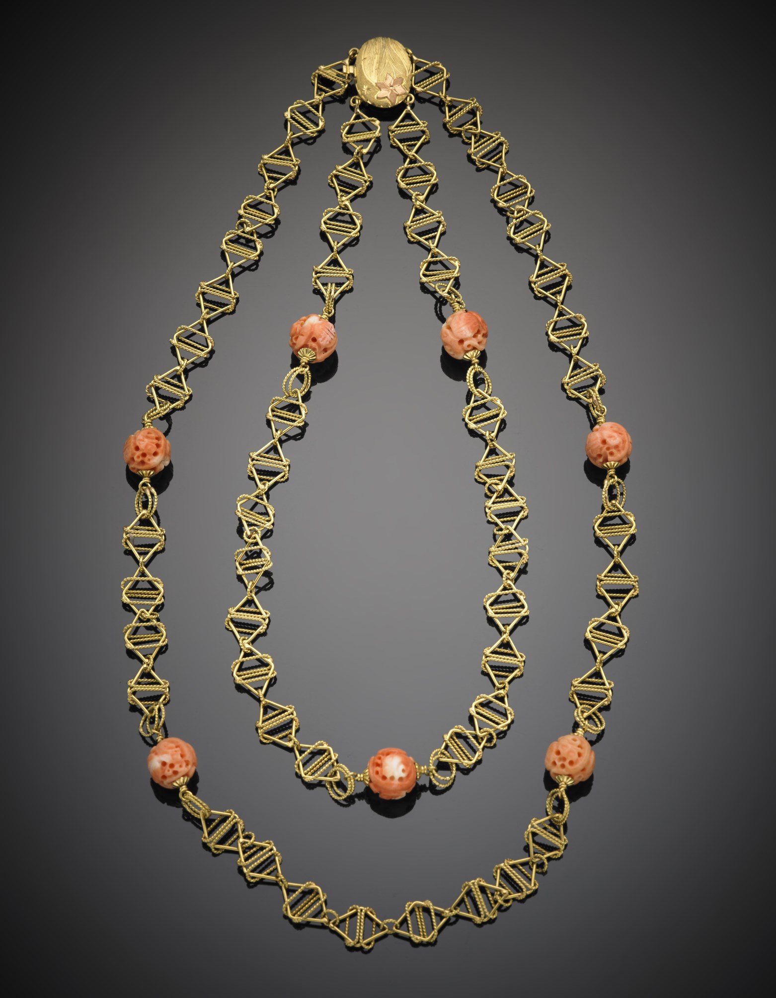 Collier a due giri in oro giallo lavorato distanziato da boules scolpite in corallo rosa, chiusura rifinita in oro rosso g. 56, lungh. primo giro interno cm 41 circa A two-strand chased gold necklace with pink coral spacers, red gold clasp