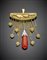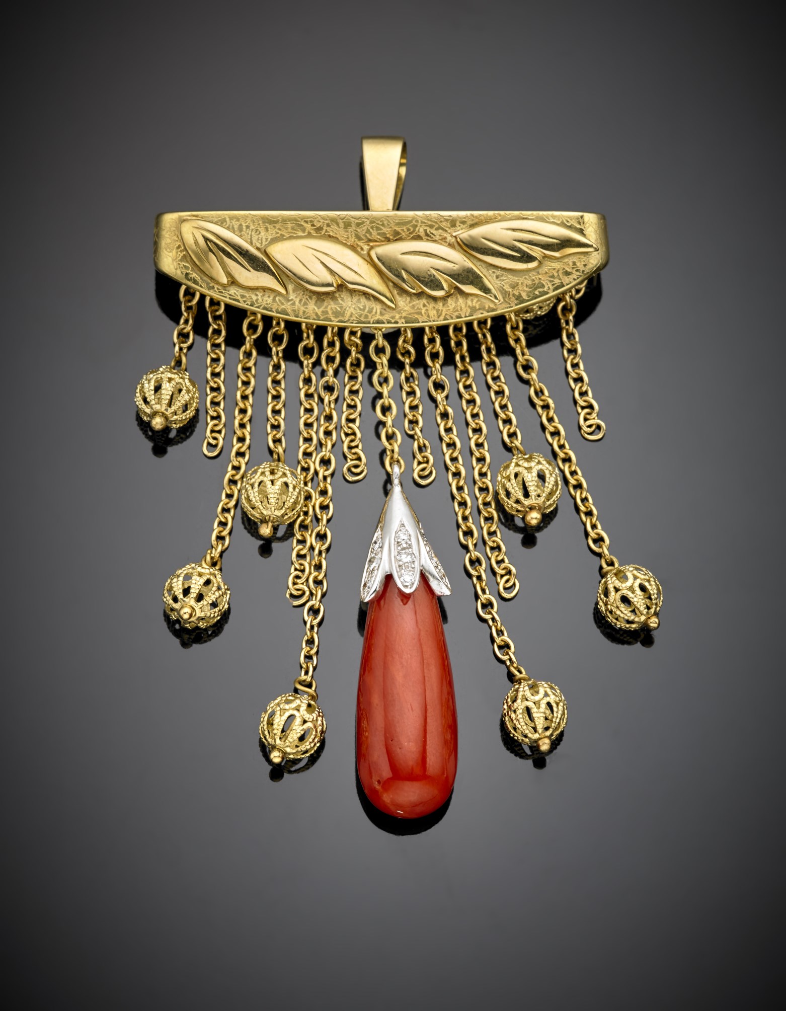 Pendente/spilla in oro giallo lucido e satinato con al centro del pendente un corallo rosso a goccia rifinito in oro bianco e diamanti g. 23,60, lungh. cm 6/7 circa A gold pendant/brooch centered by a red coral drop