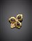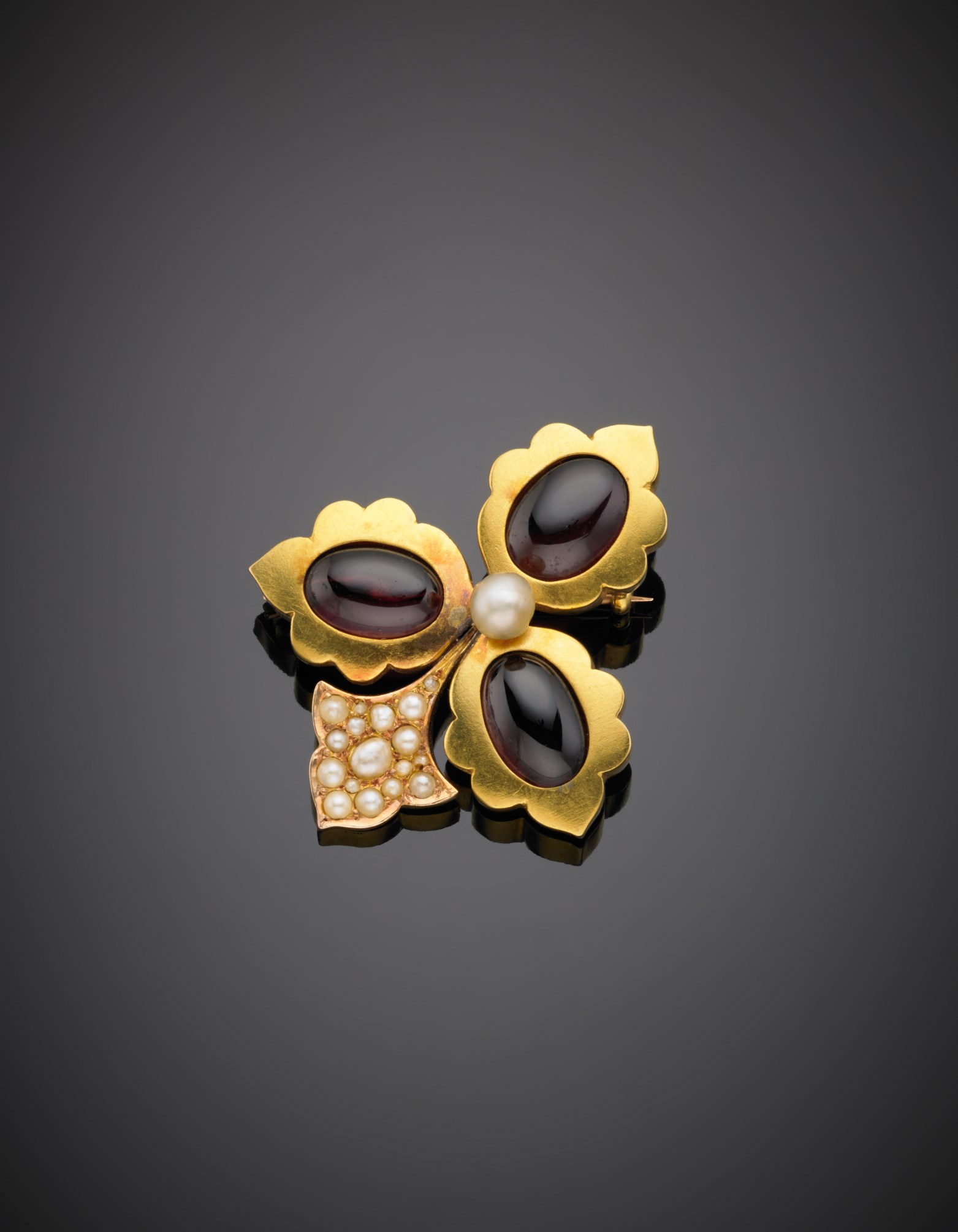 Spilla in oro giallo con tre granati ovali cabochon, mezze perle ed al centro...