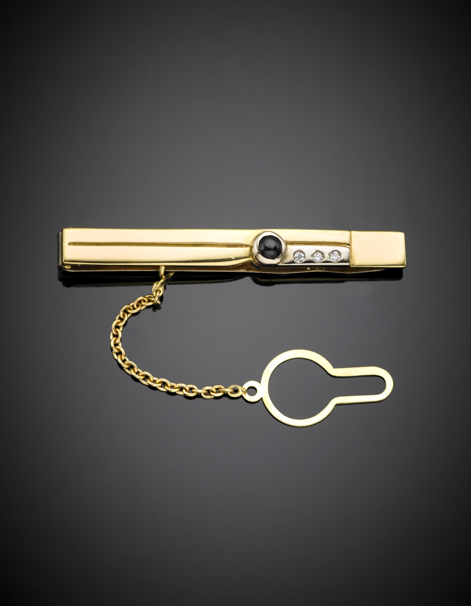 Fermacravatte in oro giallo e bianco, diamanti e cabochon in onice rotondo g....