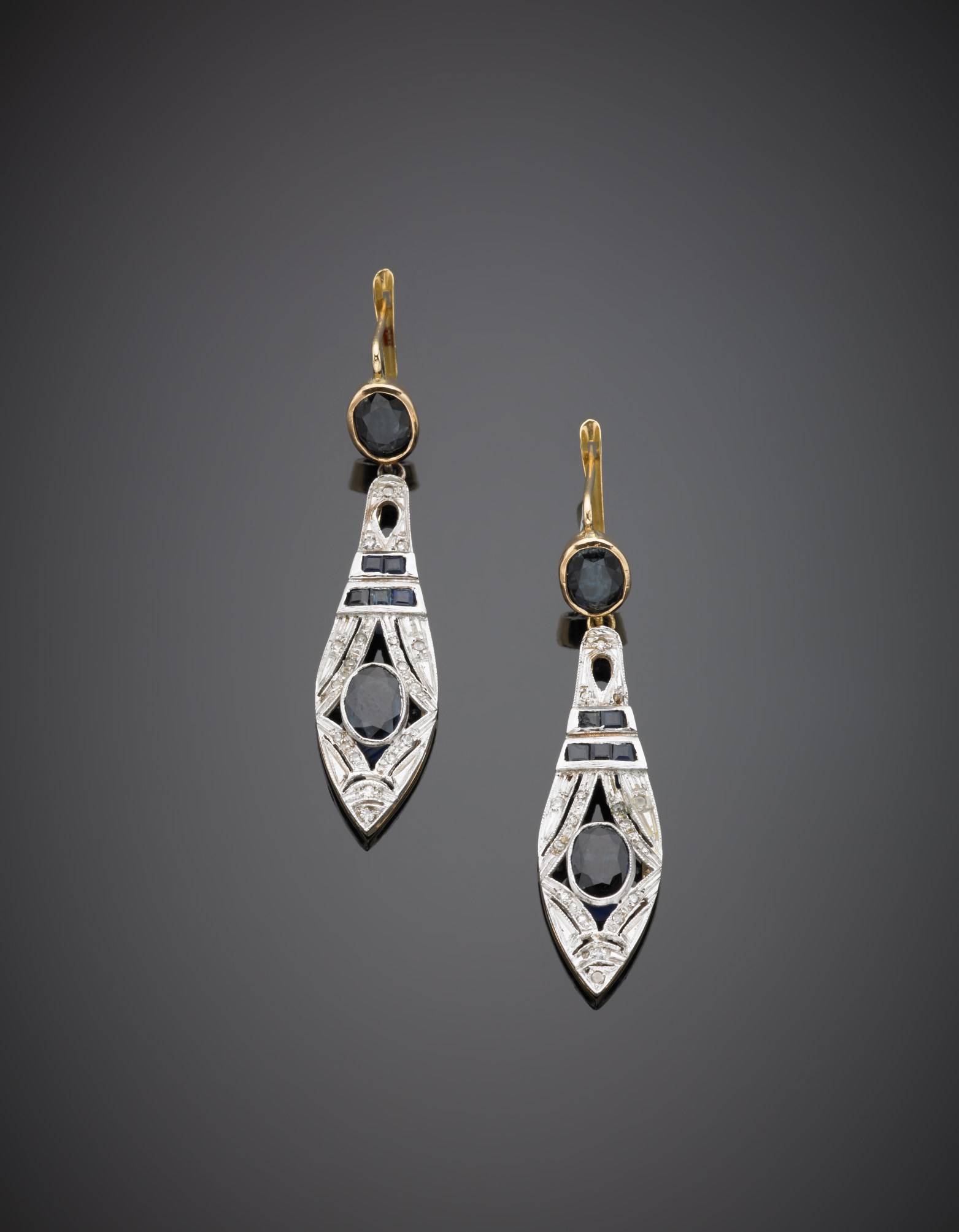 Orecchini pendenti in oro bianco e giallo con zaffiri ovali e carrè rifiniti con diamanti g.9,60 lungh. cm 2,1 circa Bi-coloured gold diamond and sapphire pendant earrings
