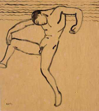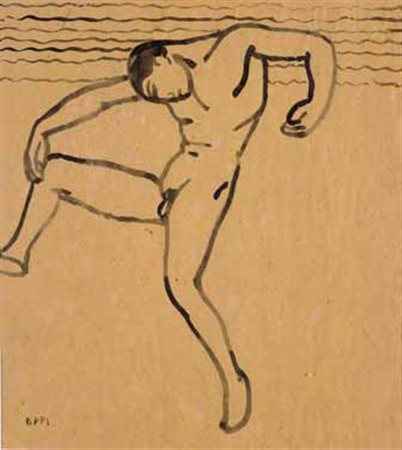 Ubaldo Oppi Bologna 1889 – Vicenza 1942 Uomo nudo che danza sulla spiaggia (Movimento dinamico), 1913 inchiostro su carta, cm 26x28,8. Firmato in basso a sinistra: Oppi. Esposizioni: Vicenza, Palazzo Chiericati, Mostra retrospettiva di Ubaldo Oppi, 25 ottobre-14 dicembre 1969 (etichetta al verso);. Bibliografia: Mostra di Ubaldo Oppi, catalogo della mostra, a cura di L. Magagnato, Ed. Comune di Vicenza, Vicenza 1969, n. 31, Tav. 14 riprodotto b/n.