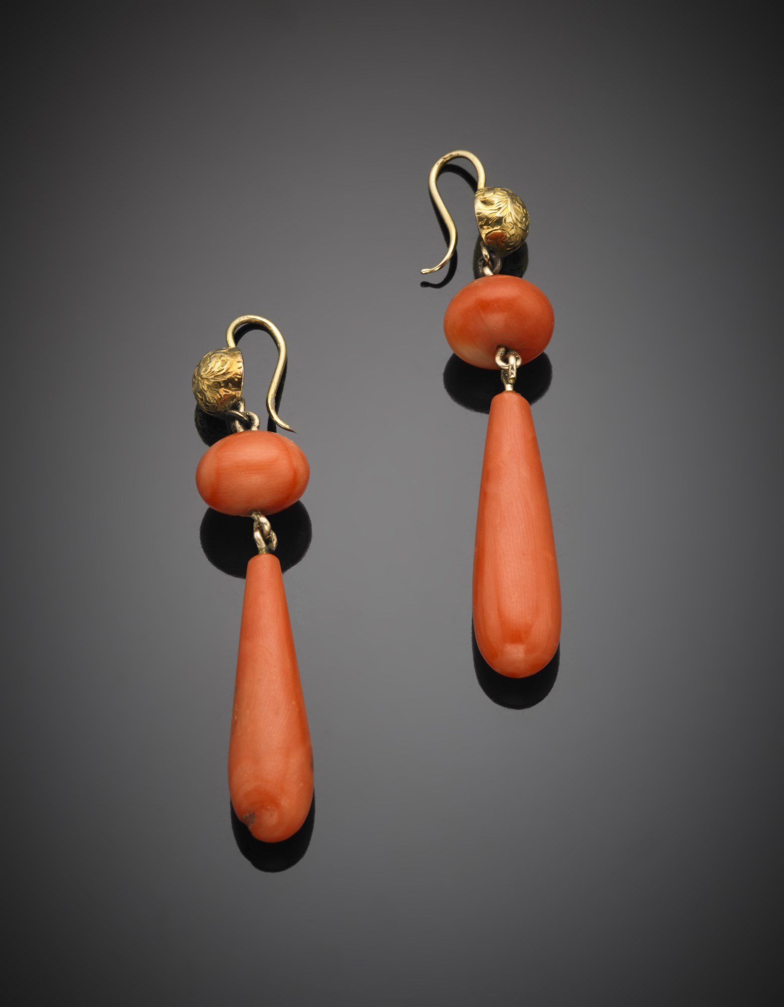 Orecchini pendenti a monachella in oro giallo con boules e gocce in corallo...