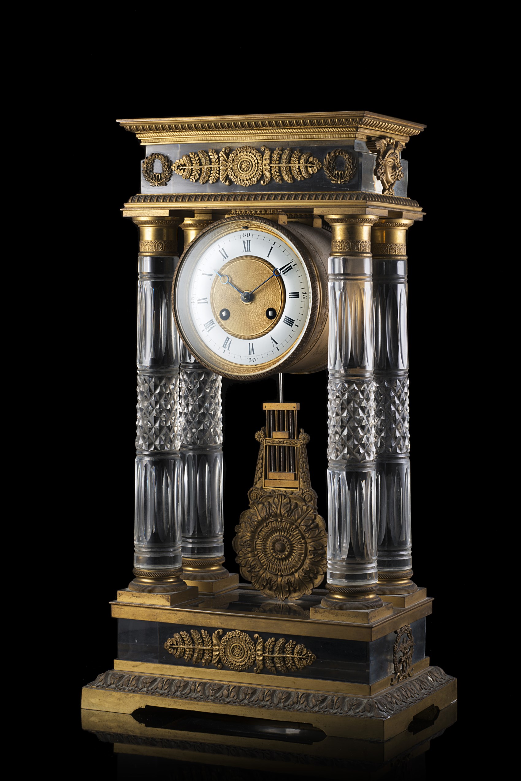ANONIMO Pendola di struttura architettonica a quattro colonne in bronzo dorato e cristallo molato Epoca seconda met‡ sec. XIX Quadrante smaltato con numeri romani Movimento con carica settimanale, suoneria delle ore e delle mezze su campanello, sospensione a lamelle, scappamento ad ancora Misura h cm 48 ANONIMOUS Ormolu and cristal mantel clock Enamelled dial with Roman numerals France, second half 19th century (defects) h cm 48