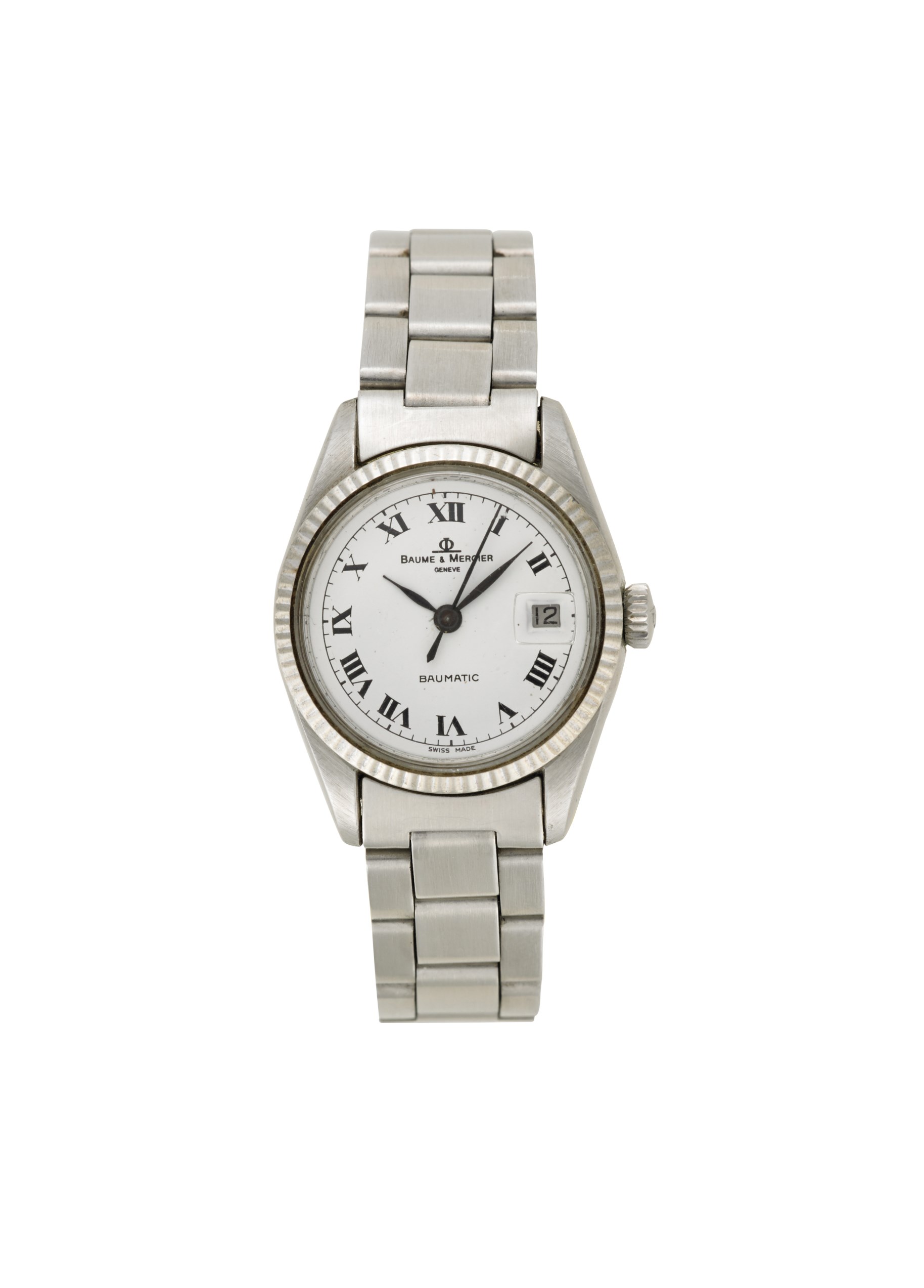 BAUME & MERCIER Orologio da polso da donna in acciaio Anni '80 Quadrante, movimento e cassa firmati Movimento con carica automatica Quadrante bianco con cifre romane, secondi al centro, finestrella per data Cassa n. 146402 1215-1 Diam. mm 25 BAUME & MERCIER Lady's steel wristwatch 1980s Dial, movement and case signed Automatic wind movement White dial, Roman numerals Diam. mm 25