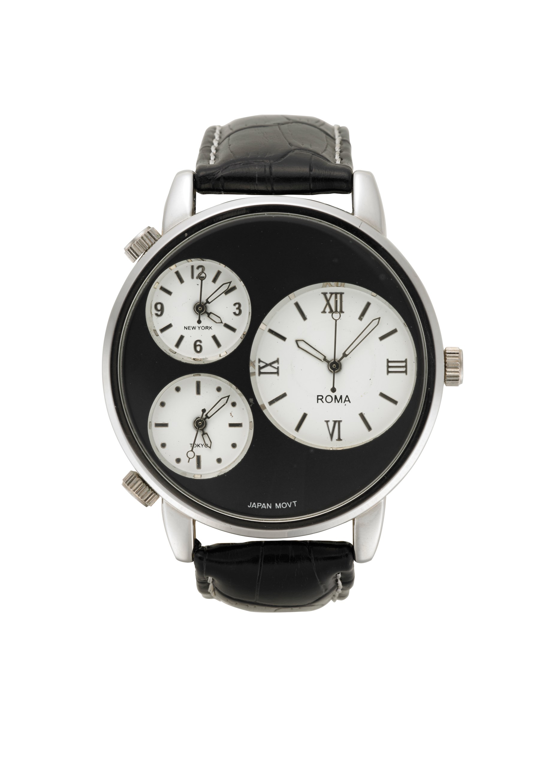 ANONIMO Orologio da polso da uomo in acciaio Epoca recente Movimento al quarzo Quadrante color lavagna con tre quadrantini ausiliari con fusi orari Diam. mm 52 circa ANONYMOUS Gent's steel wristwatch Recent date Quartz movement Grey dial, auxiliary dials Diam. mm 52