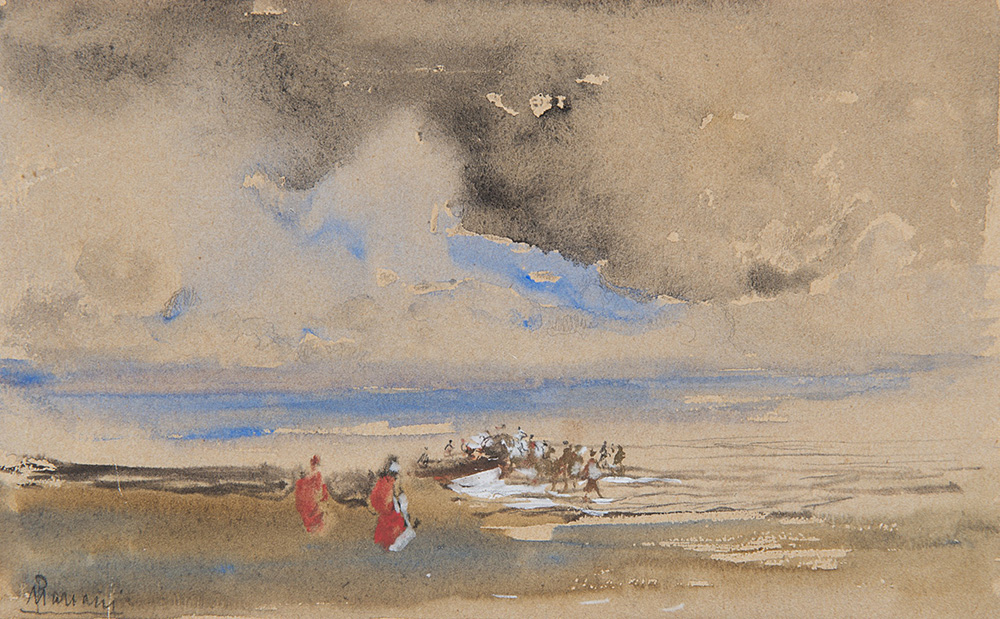 Pompeo Mariani (Monza 1857 - Bordighera 1927) "Marina con figure" tecnica mista su carta applicata a cartoncino(cm 12x19) Firmato a matita in basso a sinistra Al retro: autentica di Enrico Piceni datata 1971 In cornice