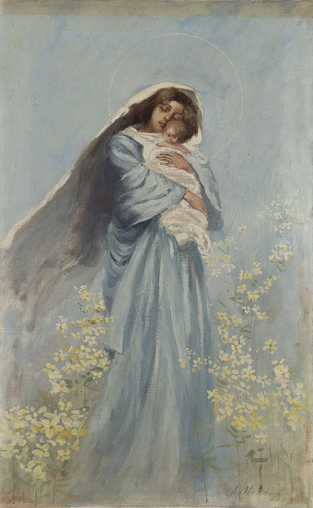 Gian Emilio Malerba (Milano 1880 - 1926) "Madonna con Bambino" olio su tela (cm 69x43.5) Firmato in basso a destra Al retro: iscrizione "Omaggio dell'autore agli sposi Carlo Longoni e Sampietro Sofia lÏ 26 agosto 1900" / Dipinto del pittore Emilio Malerba, Egisto Marconi 21.9.1946 In cornice
