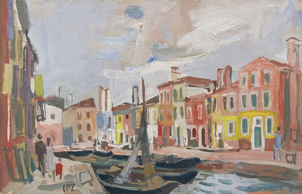 Carlo Dalla Zorza (Venezia 1903 - 1977) "Burano" '52 olio su cartone (cm 9.5x15) Siglato in basso a sinistra Provenienza: Galleria d'arte Ponte Rosso, Milano. Cartiglio e timbri al retro In cornice