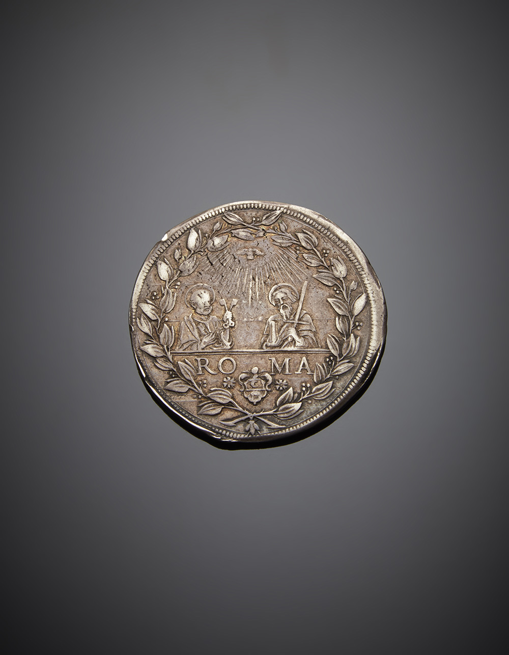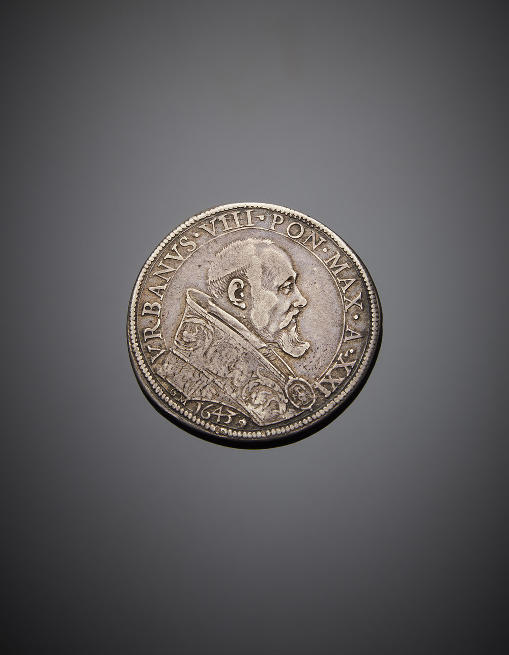 ROMA. Urbano VIII (1623-1644). Piastra 1643/XXI, con al R/ mezze figure di S. Pietro e S. Paolo. Muntoni 28. AG. Rara. BB