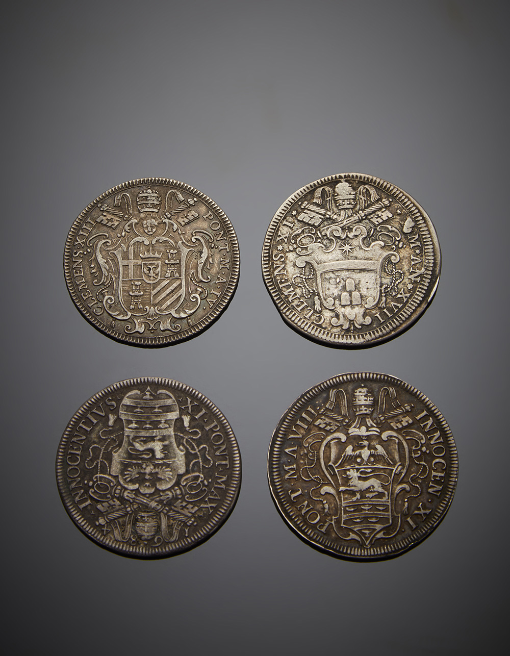 ROMA. Lotto di 4 testoni: Innocenzo XI, anni 1684 e 1684/VIII; Clemente XI, anno XVII; Clemente XIII, 1761/IV. AG. Tre BB, uno BB/MB