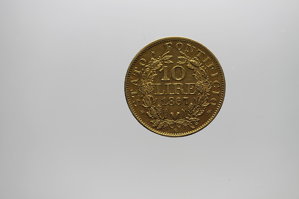 ROMA. Pio IX (3∞ periodo 1866-1870). Da 10 lire 1867/XXII. Pagani 542. Oro. Rara. Graffio sul D/. SPL