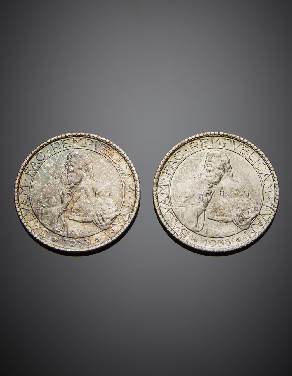 SAN MARINO. Repubblica. Da 20 lire 1933. Pagani 344. AG. FDC. Lotto di due esemplari.
