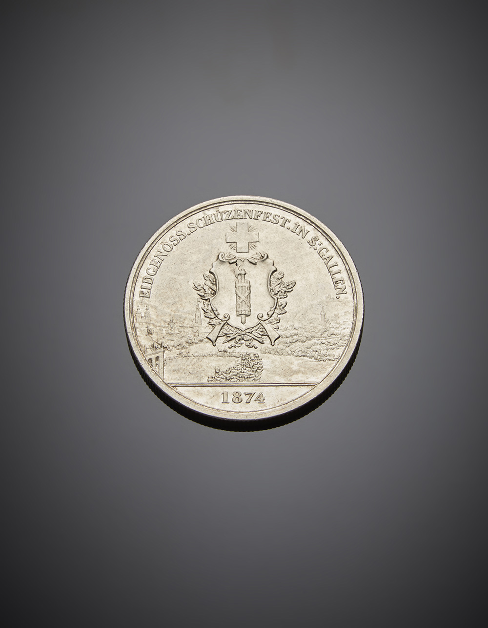 SVIZZERA. Tiri Federali. Da 5 franchi 1874. St. Gallen. KM xs12. AG. SPL