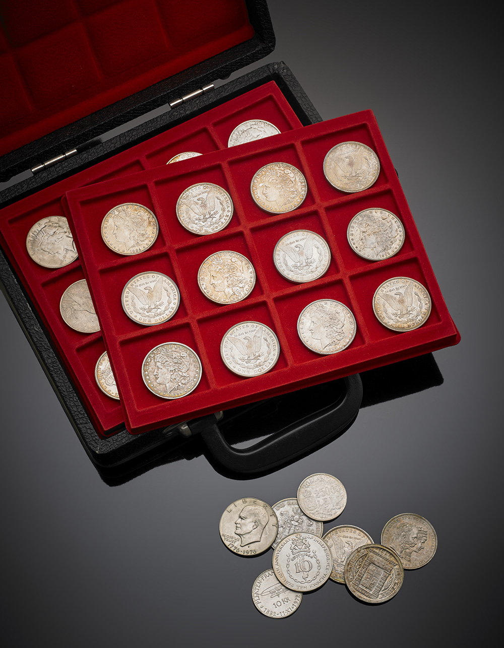 Lotto composto da un piccolo raccoglitore ad anelli con alcune monete in argento e una valigetta nera a scomparti contenente monete, quasi tutte estere, in vari metalli (da esaminare)