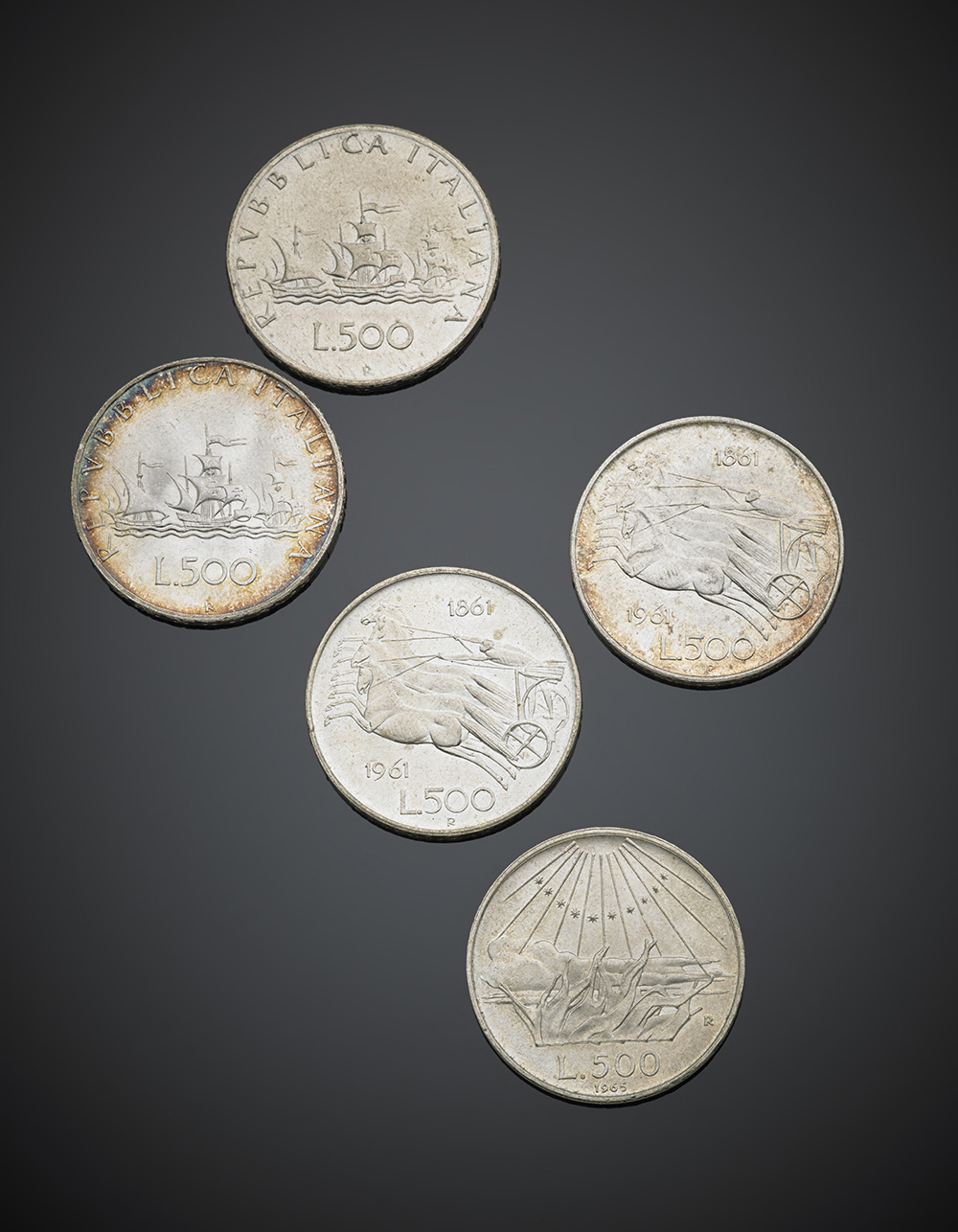 Lotto composto da cinque monete in argento della Repubblica italiana da 500 lire.