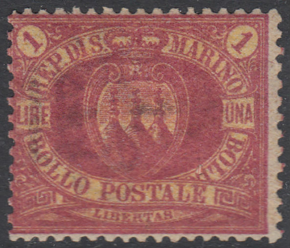 [SAN MARINO] 1892 "Stemma", 1 lira carminio su giallo. MH..........(Sass. 20)