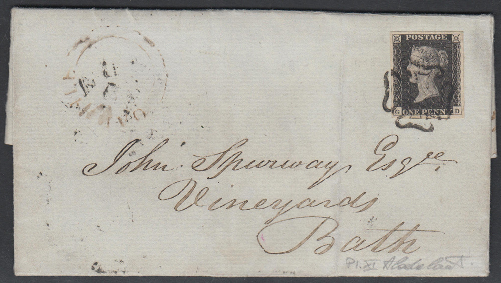 [GRAN BRETAGNA] 1841 (9 giu.) "Penny Black", lettera affrancata con 1d. nero grigiastro, tavola (plate) 11, annullato con "Croce di Malta" impressa in nero da Oakhill a Bath. Cert. Brandon Cover..........(SG AS72)