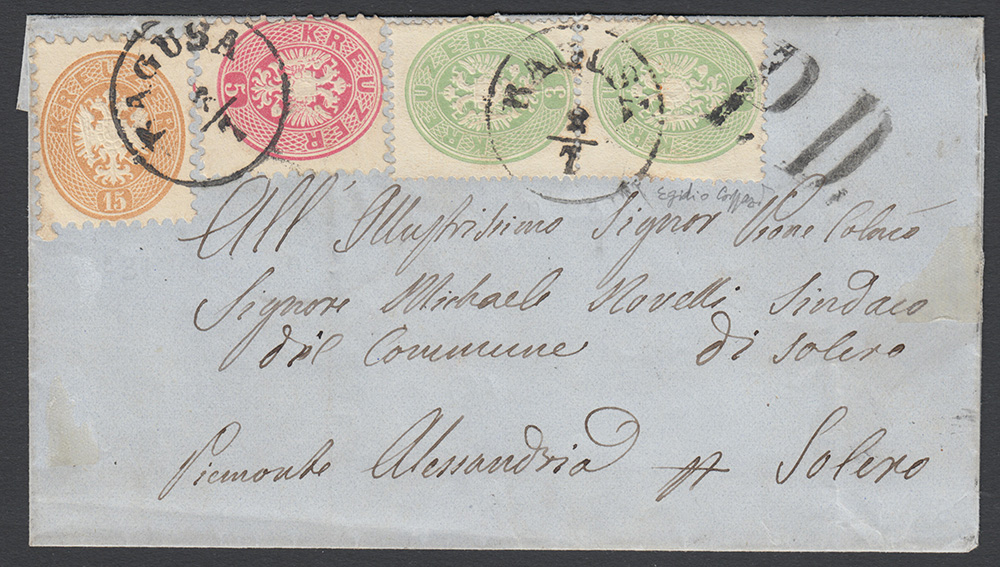 [AUSTRIA] 1864 (2 lug.) Lettera spedita da Ragusa (ufficio del Kronland della Dalmazia) per Solero (14 lug.), via Trieste e Milano, affrancata per 26k. con due es. da 3k. verde dent. 14 e 5k. rosa + 15k. bistro dent. 9,5. Cert. E. Caffaz Cover..........(Un. 23,29,31)