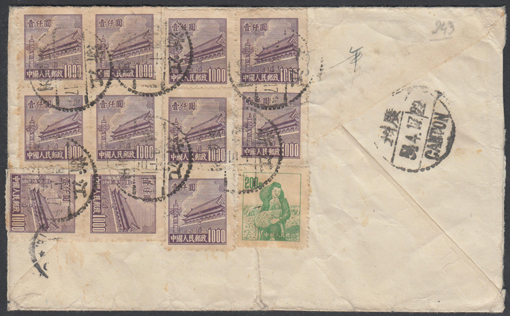 [CINA] 1954 (17 mar.) Repubblica Popolare, lettera spedita via aerea da Canton per Milano affrancata per Y11'200. Piega centrale. Da esaminare. Cover