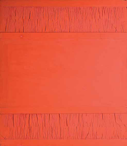 Tano Festa Roma 1938 – 1988 Rosso n. 35, 1961 tempera, legno e collage su tela, cm 95x110. Titolato, firmato e datato al verso sul telaio: Rosso n. 35, Tano Festa 1961. Provenienza: Acquistato direttamente dall’autore; Milano, Galleria Schwarz (etichetta al verso sul telaio); Modena, Galleria d’Arte Moderna Emilio Mazzoli; Nuova Brerarte, Milano, asta 87, 22 maggio 1989, Arte contemporanea. Storie e avanguardie, lotto 87. Esposizioni: Genazzano, Castello Colonna di Genazzano. Polo Museale Internazionale per l’Arte Contemporanea, Cross-roads. Incroci, 31 marzo-24 giugno 2001. Bibliografia: A. Amendola, R. Civello, Tano Festa, Giorgio Corbelli, Brescia 1991, n. 2, p. 116; Cross-roads. Incroci, catalogo della mostra, a cura di A. Boatto, G. Mercurio, Campisano Editore, Roma 2001, n. 102, p. 126 riprodotto. Opere registrata presso l’Archivio Tano Festa, Studio Soligo, Roma, con la sigla 61750/GT157.