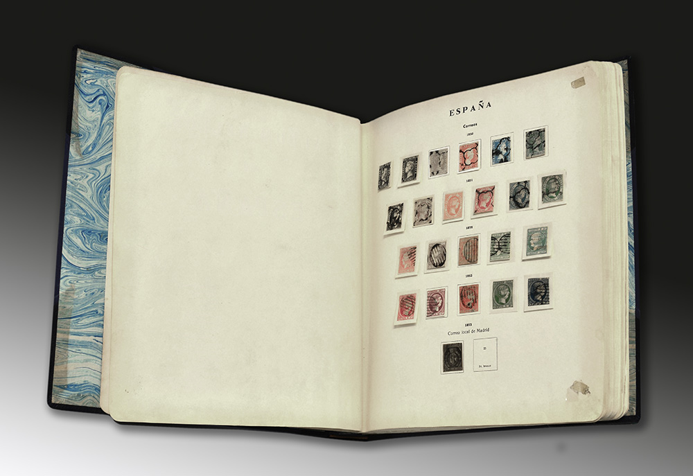 [SPAGNA] 1850/1956 Collezione del periodo pressochÈ completa, mancante di pochissimi esemplari, con foglietti, posta aerea, espressi e con parte degli altri servizi, principalmente nuova a partire dal 1889 montata su antico album artiginale senza taschine. Buona parte degli esemplari nuovi sono di prima linguella. Da esaminare. MH/Used
