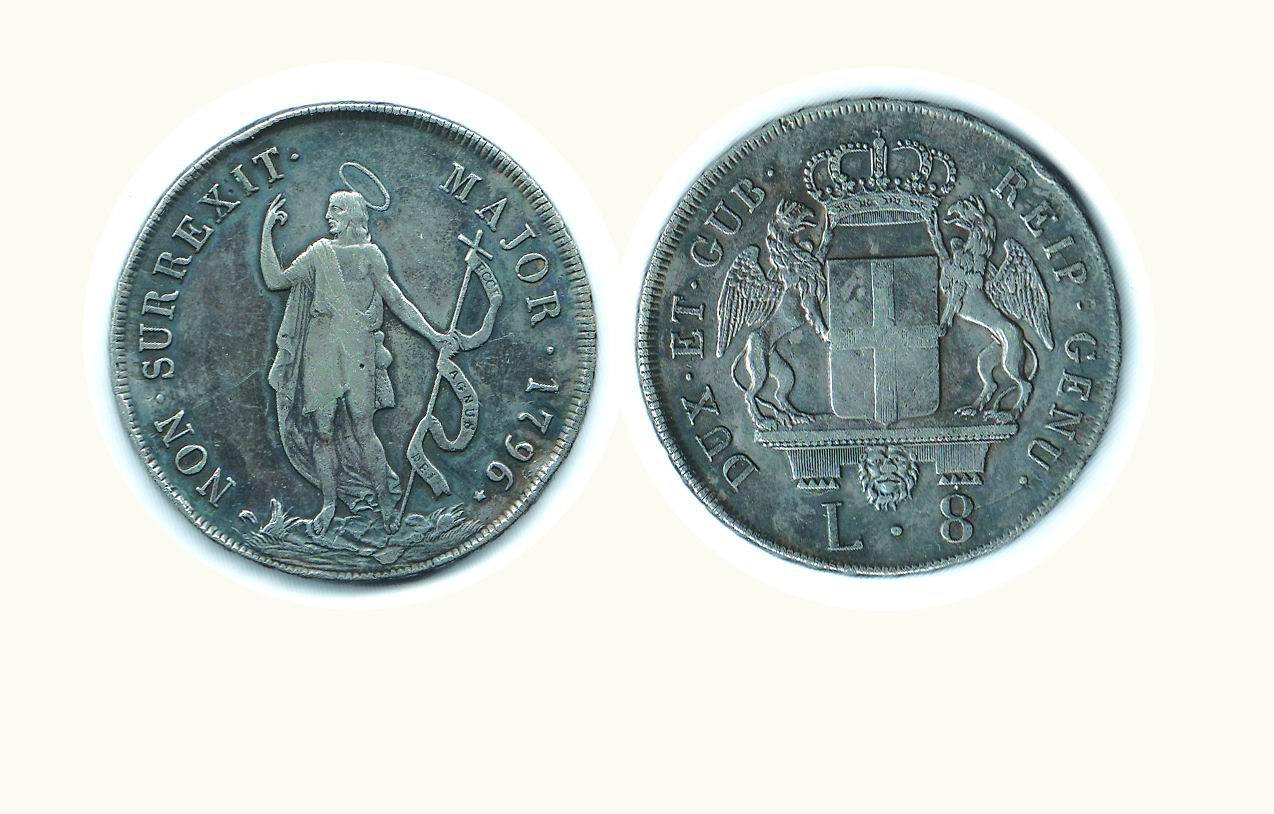 GENOVA - Dogi Biennali - 8 Lire 1796 - Stella; D/ Stemma coronato tra grifi, all'esergo L - 8; R/ S. G. Battista predicante - Lun.364. Metallo: AR - Conservazione: BB