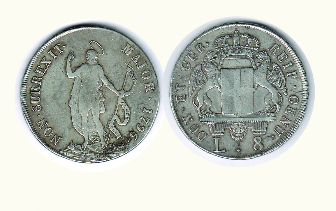 GENOVA - Dogi Biennali - 8 Lire 1796 - Stella; D/ Stemma coronato tra 2 grifoni, all'esergo, L - 8; R/ S. G. Battista predicante - Lun.364. Metallo: AR - Conservazione: q.BB/BB