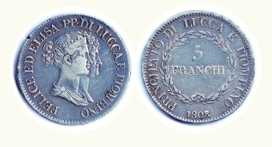 LUCCA e PIOMBINO - (1805-1814)- 5 Fr. 1808 (data corretta 8 su 7). Metallo: AR - Conservazione: BB+