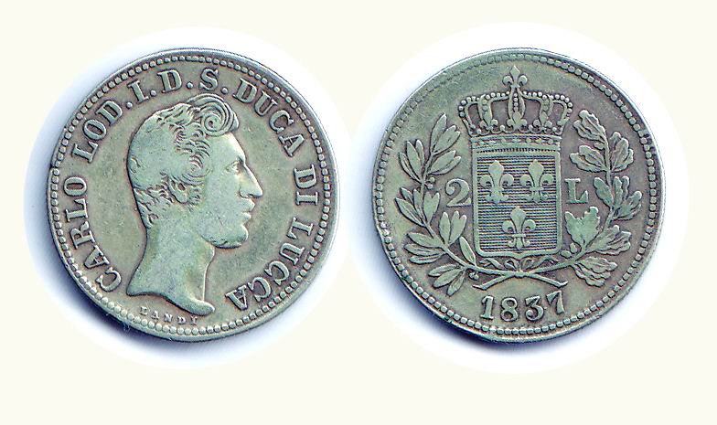 LUCCA - Carlo Ludovico di Borbone (1824-1847) - 2 Lire 1837 - P.261. Rarità: R - Metallo: AR - Conservazione: BB