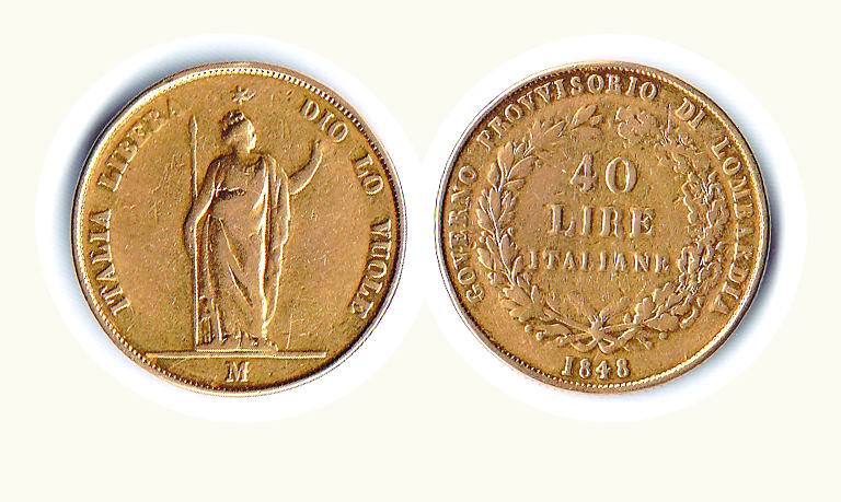 MILANO - Governo Provvisorio - 40 Lire 1848 - Impercettibile traccia d'appicagnolo. Rarità: R - Metallo: AU - Conservazione: q.BB/BB