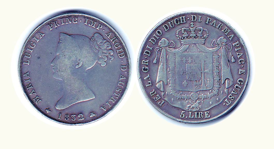 PARMA - Maria Luigia - 5 Lire 1832. Rarità: RR - Metallo: AR - Conservazione: MB/q.BB