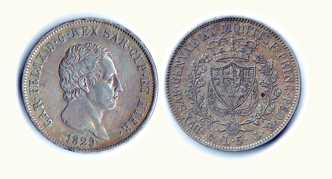 CARLO FELICE - 5 Lire 1829 GE - P.76. Metallo: AR - Conservazione: q.SPL