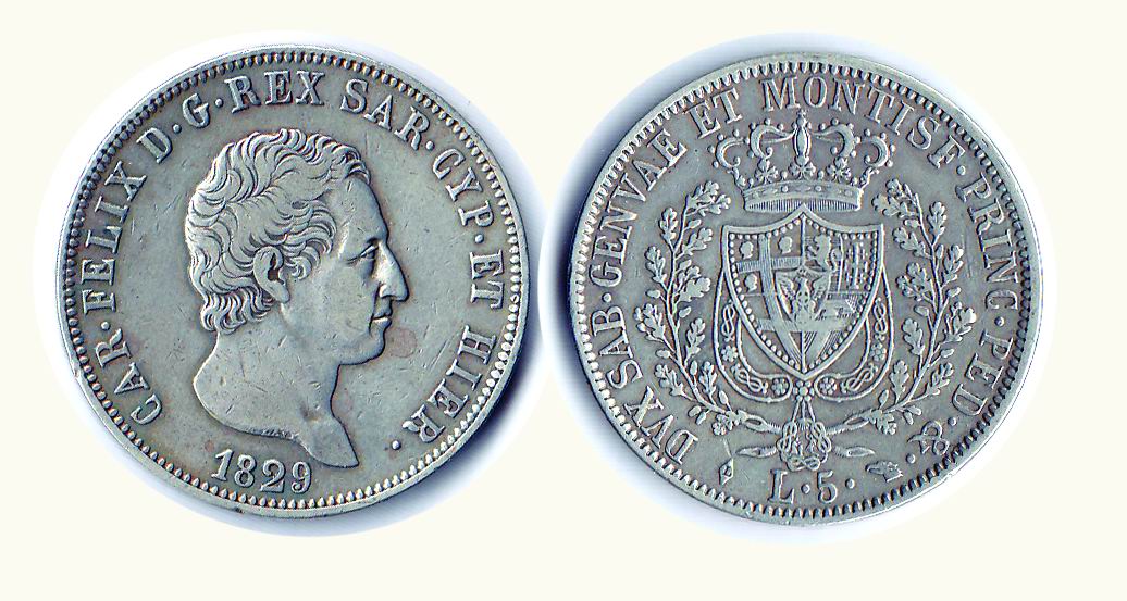 CARLO FELICE - 5 lire 1829 TO - 311.825 pezzi coniati - P.77. Metallo: AR -...