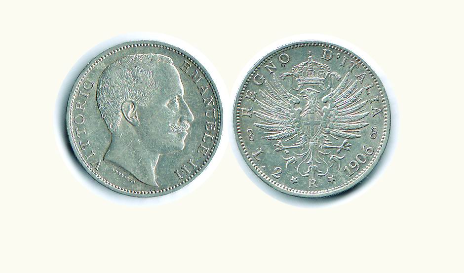 VITTORIO EMANUELE III - 2 Lire 1906 - Aquila sabauda - P.730. Metallo: AR - Conservazione: BB+/q.SPL