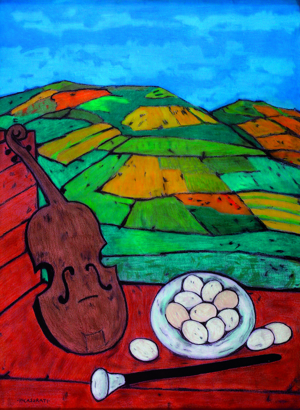 Felice Casorati "Viola Uova e flauto 1962" tempera su cartoncino 58x79 pubblicato su catalogo Generale N° 1357