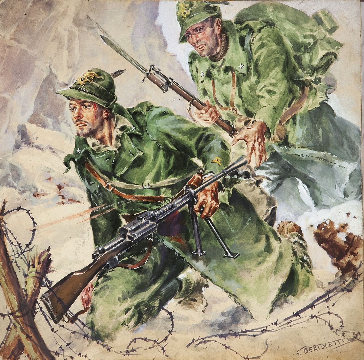 BERTOLETTI G. "Scena di battaglia - Sanpietro Franco" 30x30 tempera su cartoncino Opera firmata in basso a destra e intitolata al retro Bozzetto raffigurante un soldato decorato con la medaglia d'oro, eseguito tra il 1942 e il 1943 per la copertina della rivista "Il Corriere della Domenica"