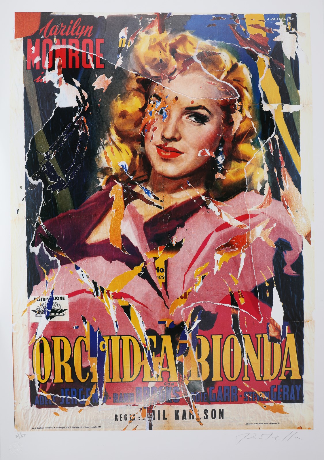 ROTELLA MIMMO (1918 - 2006) Orchidea bionda. Litodecollage. Cm 70,00 x 100,00. 13/125. Tiratura e firma a matita in basso. Timbro a secco Fondazione Mimmo Rotella, Milano in basso a sinistra. Pubblicazione: Mimmo Rotella - Multiples décollages, Silvana Editoriale, 2005, pag. 81.