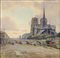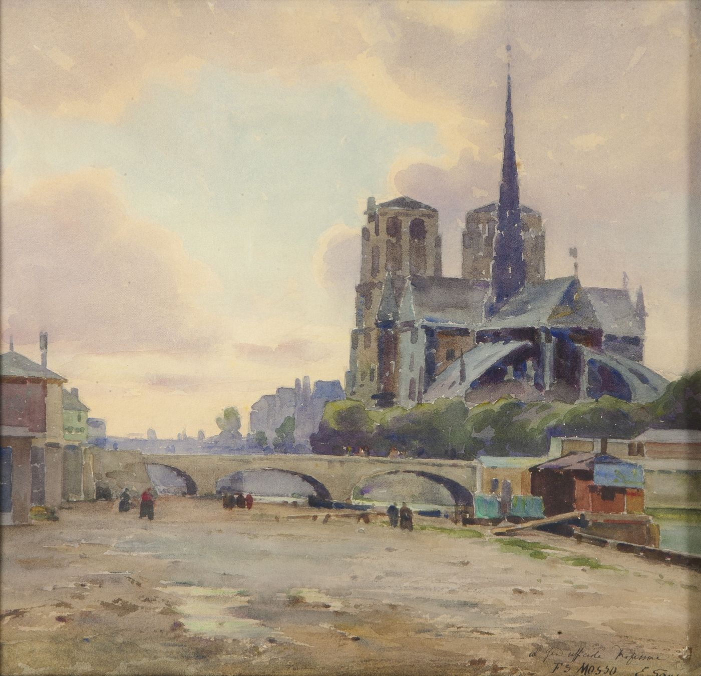 GAYS EUGENIO Rivara Canavese (TO) 1861 - 1938 Cuorgnè (TO) "Veduta di Notre Dame de Paris" 30x33,5 acquerello su cartoncino Opera firmata in basso a destra con dedica