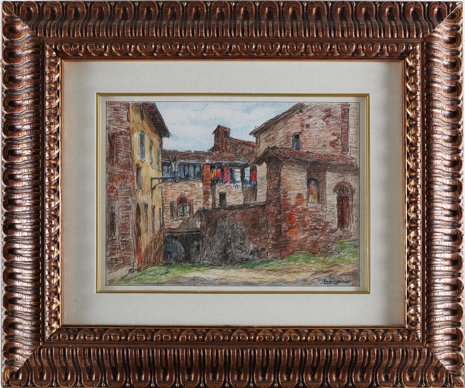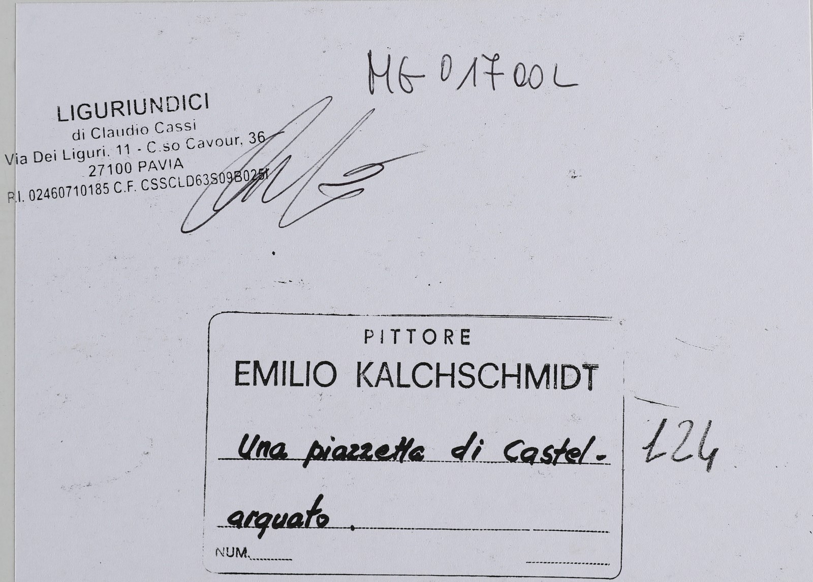 KALCHSCHMIDT EMILIO (1902 - 1983) Una piazzetta di Castelarquato. . 1975. Tecnica mista su carta. Cm 30,00 x 40,00. Al retro cartiglio galleria Liguriundici Arte, Pavia. Firma e anno in basso a destra.