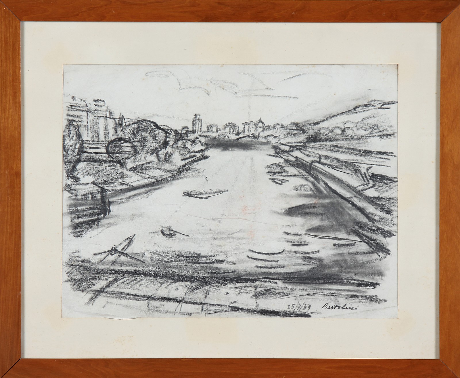 BARTOLINI LUIGI (1892 - 1963) Il fiume. 1959. Carboncino su carta. Cm 41,00 x 31,00. Firma e data in basso a destra. Cornice presente