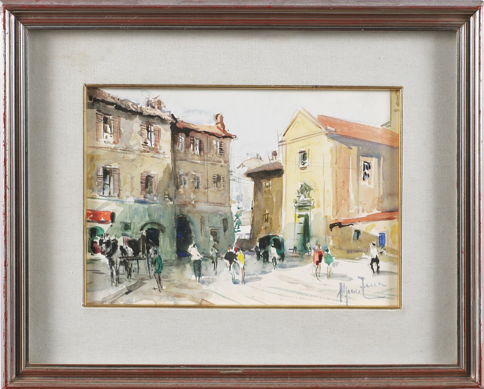 ZECCA ALFREDO (1917 - 1998) Senza titolo. Acquerello su cartone. Cm 35,00 x 25,00. Firma in basso a destra. Al retro Firma, titolo (illeggibile) e timbro della galleria Dagrada, Via Lanzone 33. Cornice presente