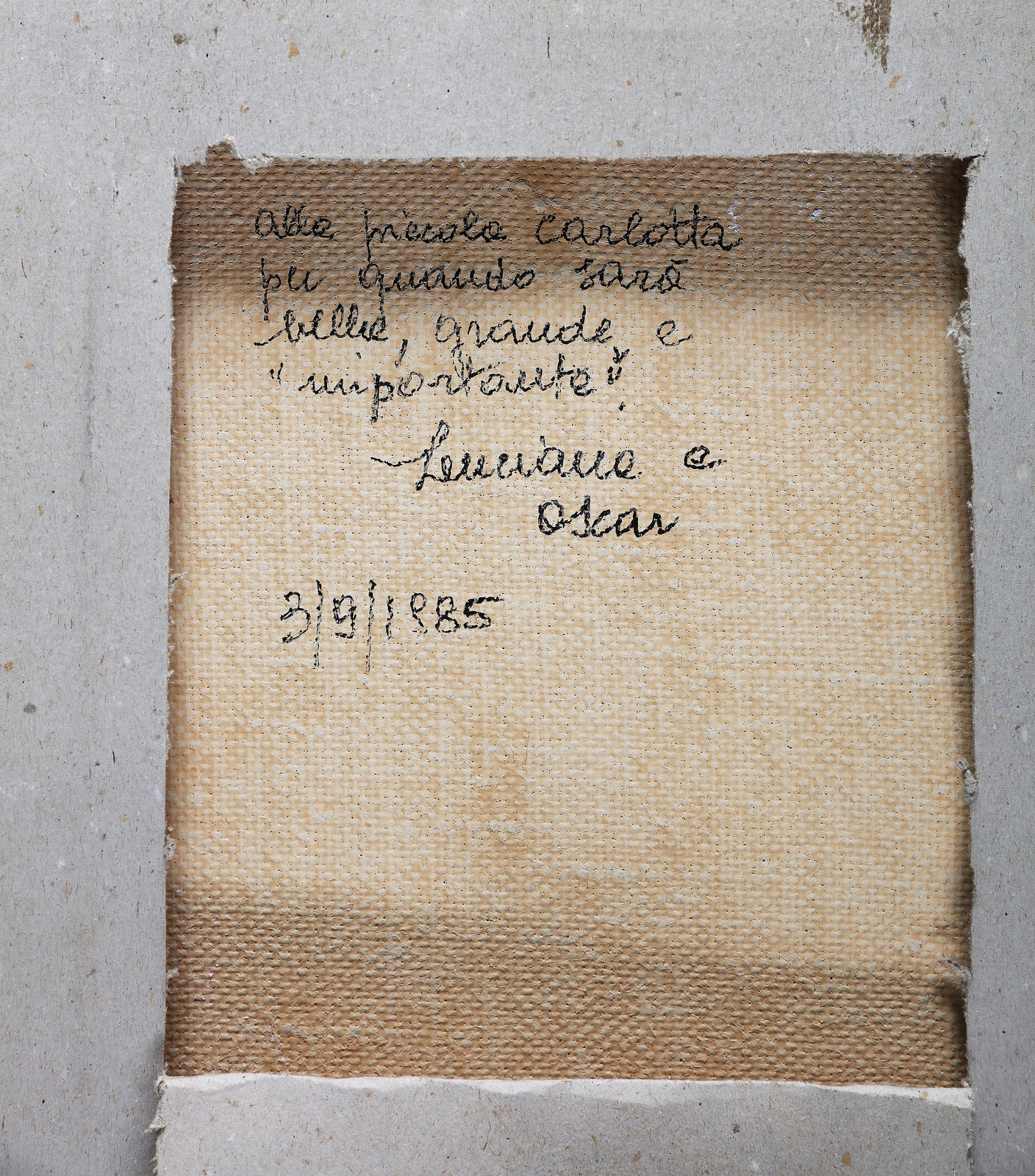 BRENNA CARLO (n. 1935) Senza titolo. . Olio su tela. Cm 37,00 x 46,00. Firma in basso a destra. Al retro dedica. . Cornice presente