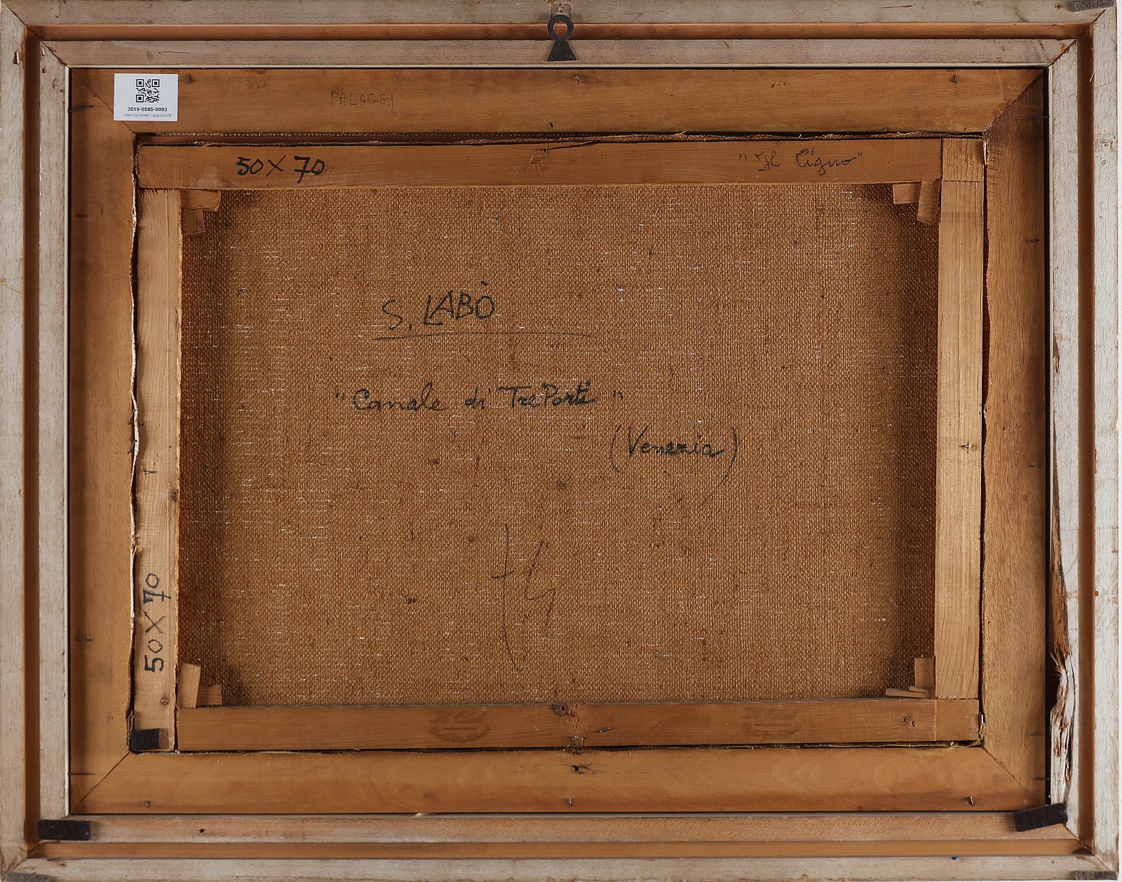 LABO SAVINIO (1899 - 1976) Canale di Tre Porti. . Olio su tela. Cm 70,00 x 50,00. Firma in basso a destra. Al retro titolo e firma. . Cornice presente