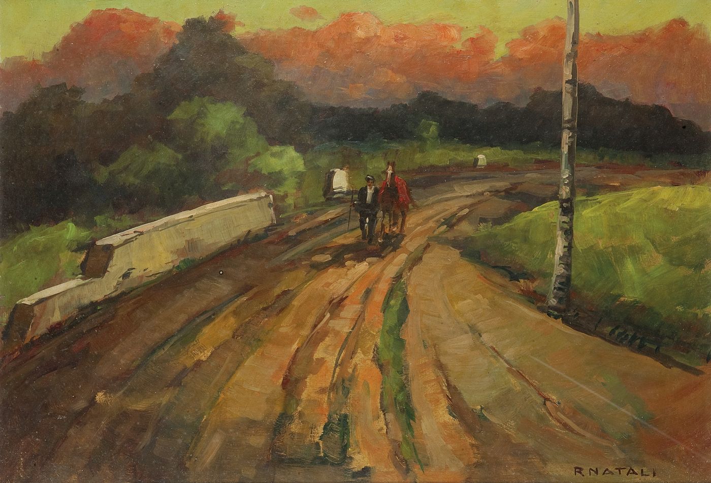 NATALI RENATO Livorno 1883 - 1979 "Colpo d'occhio campestre, col ritorno del contadino" prima metà XX sec. 35x50 olio su faesite Opera firmata in basso a destra Autentica su fotografia di Giovanni Gentile, Milano