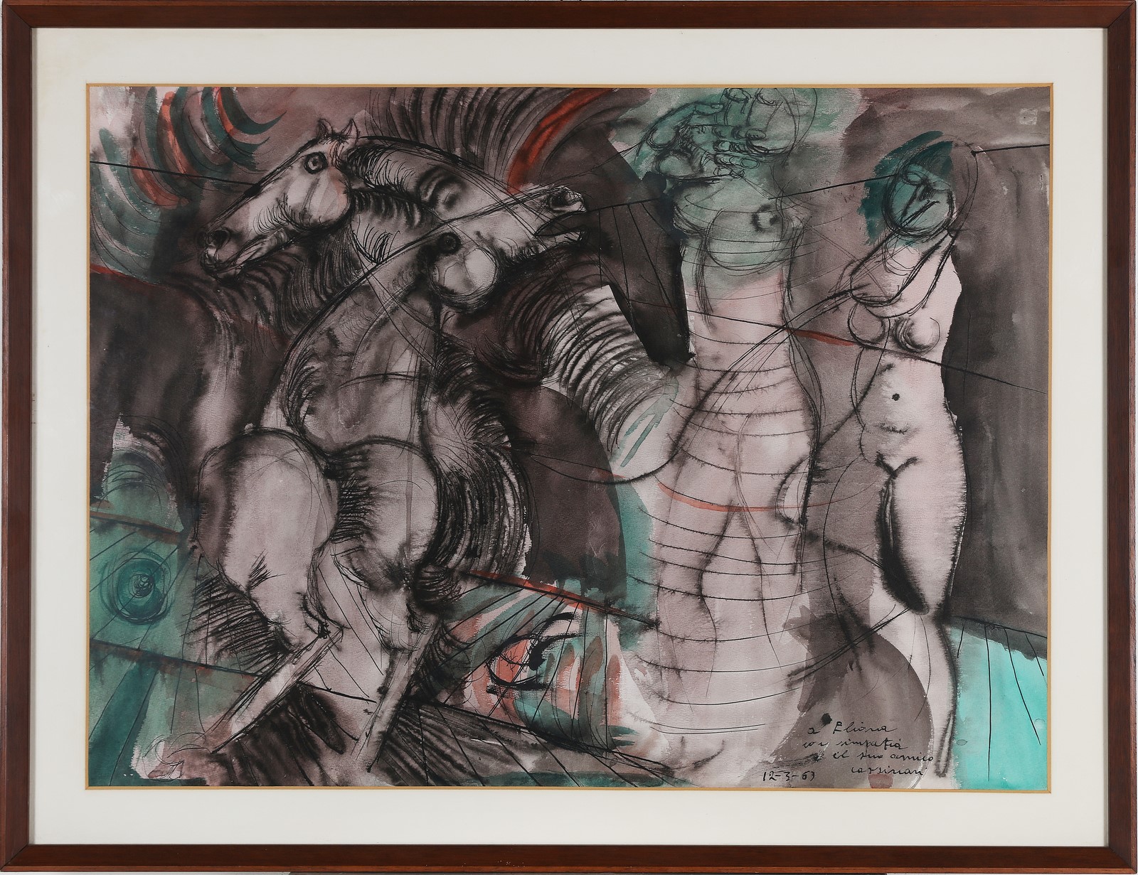 CASSINARI BRUNO (1912 - 1992) Senza titolo. 1963. Tecnica mista su carta. Cm 64,00 x 46,00. Firma, dedica e anno in basso a destra. Cornice presente